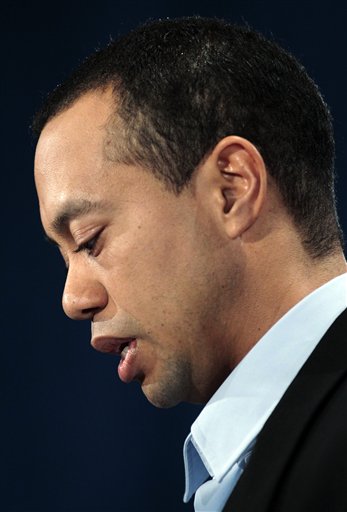 Tiger Woods makes a statement at the Sawgrass Players Club, Friday, Feb. 19, 2010, in Ponte Vedra Beach, Fla. (AP Photo/Joe Skipper, Pool)